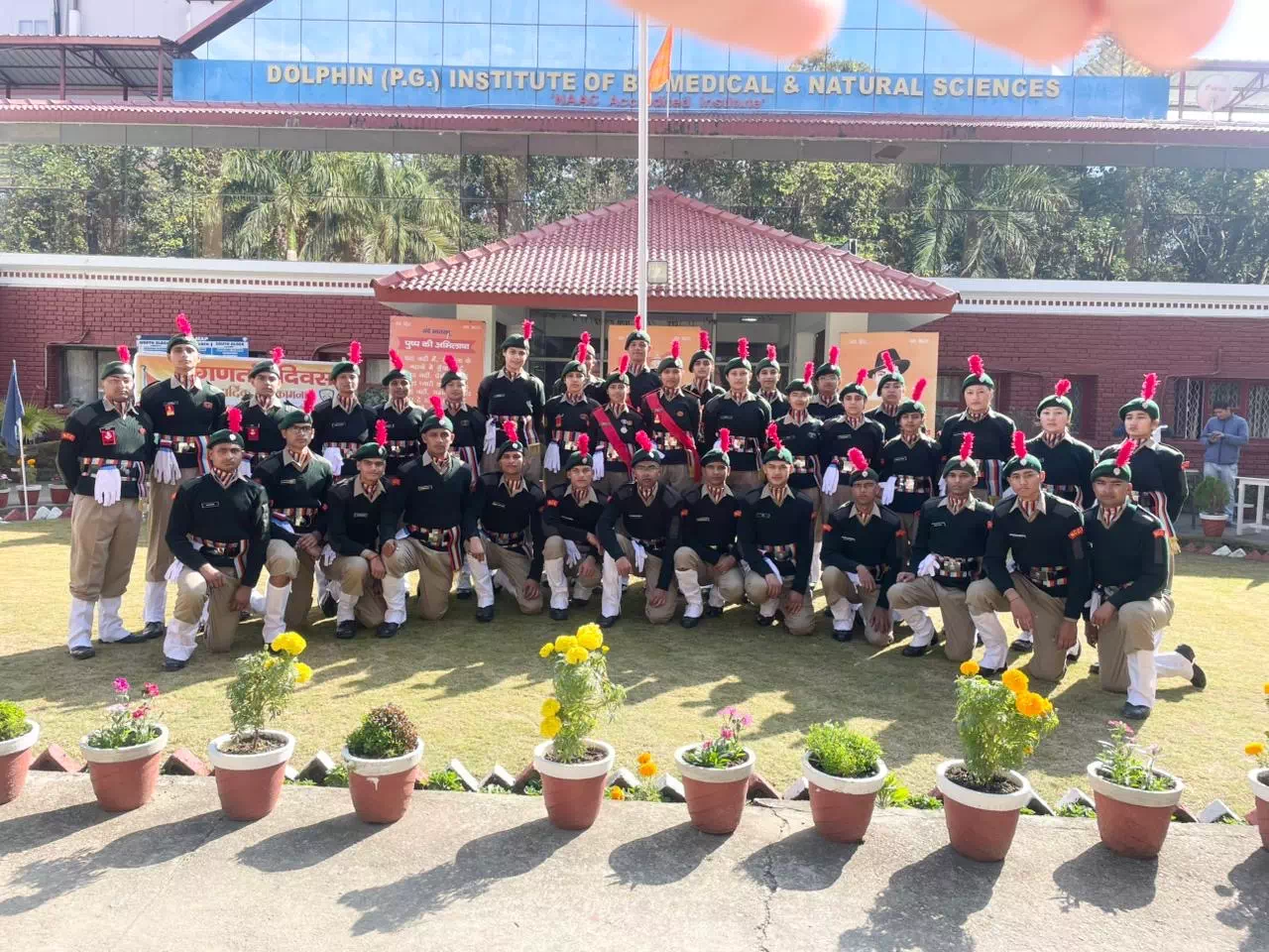 The National Cadet Corps (NCC) Army Wing at Dolphin Institute of Biomedical and Natural Sciences, Dehradun, was established in 2018 with an initial enrollment of 52 cadets, including bothSeniorDivision(SD)andSeniorWing(SW).Sinceitsinception,theunithasbeencommitted to nurturing disciplined, responsible, and nation-oriented youth.The firstAssociate NCC Officer (ANO), Lt. Rohit Maithani, was commissioned in 2019 after successfully completing training at the Officers TrainingAcademy (OTA), Kamptee, Nagpur. He further enhanced his professional competence by undergoing a refresher course at OTA Kamptee in 2023 and is expected to be promoted to the rank of Captain in 2027.